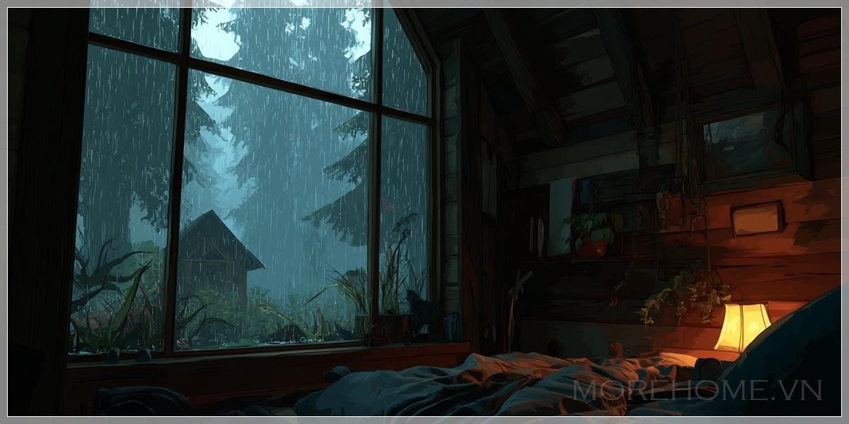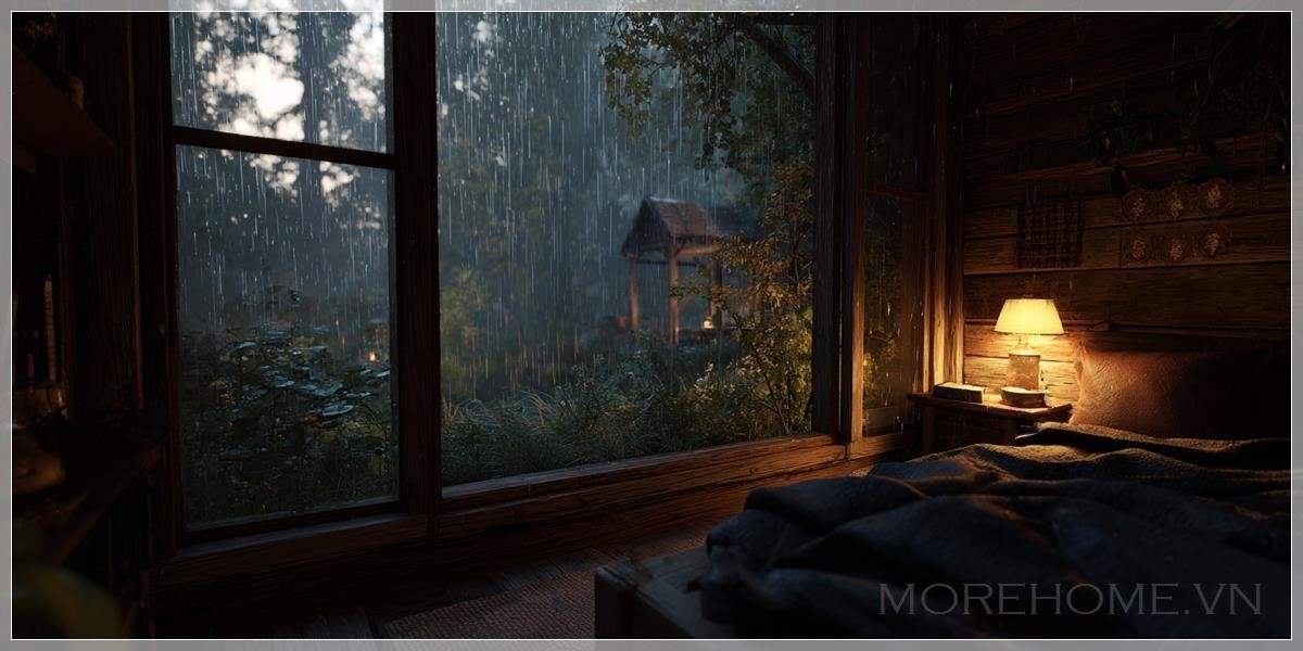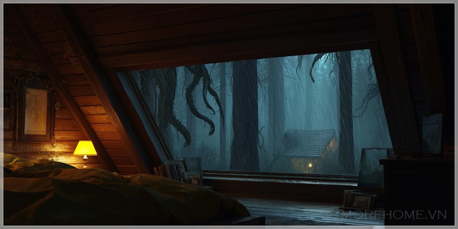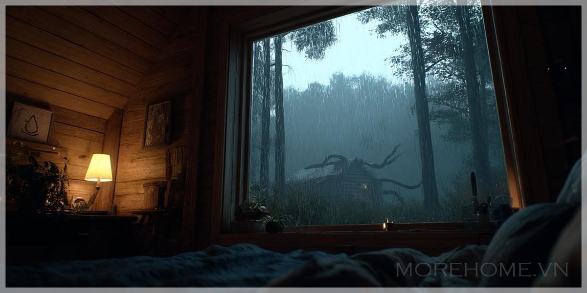 Mưa rơi không ngớt ngoài khung cửa sổ nhỏ, tạo nên một bức màn nước mờ ảo giữa căn cabin gỗ ấm cúng và khu rừng âm u. Từ chiếc giường thấp, tôi quan sát thế giới hai mặt đối lập này - bên trong là sự bảo bọc, bên ngoài là điều bí ẩn đang chờ đợi.