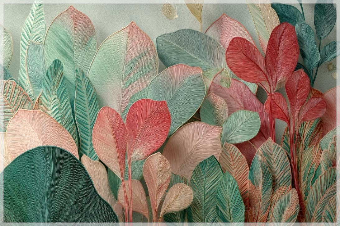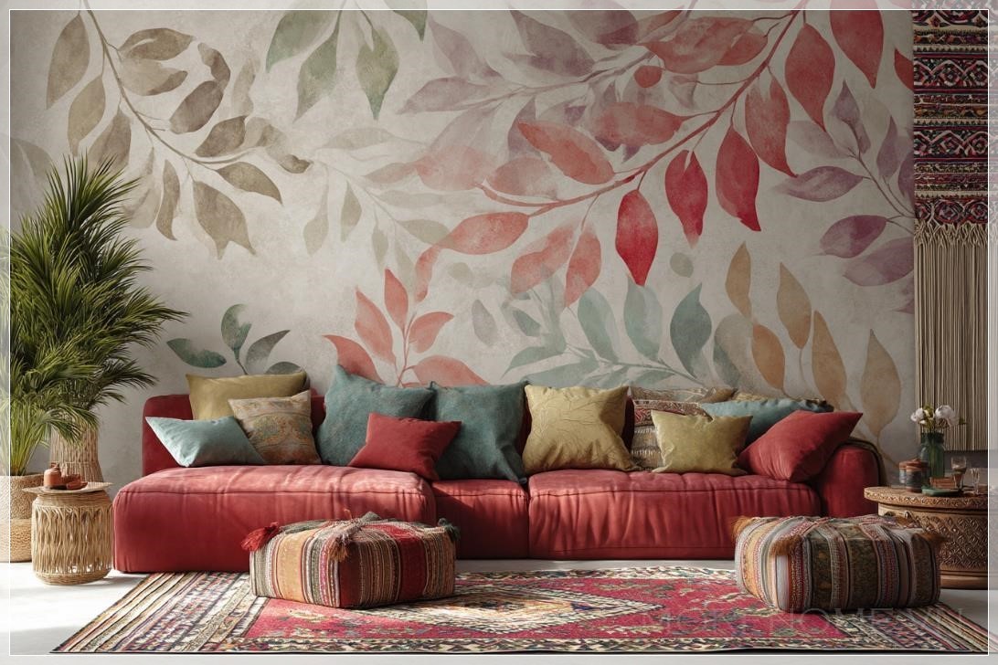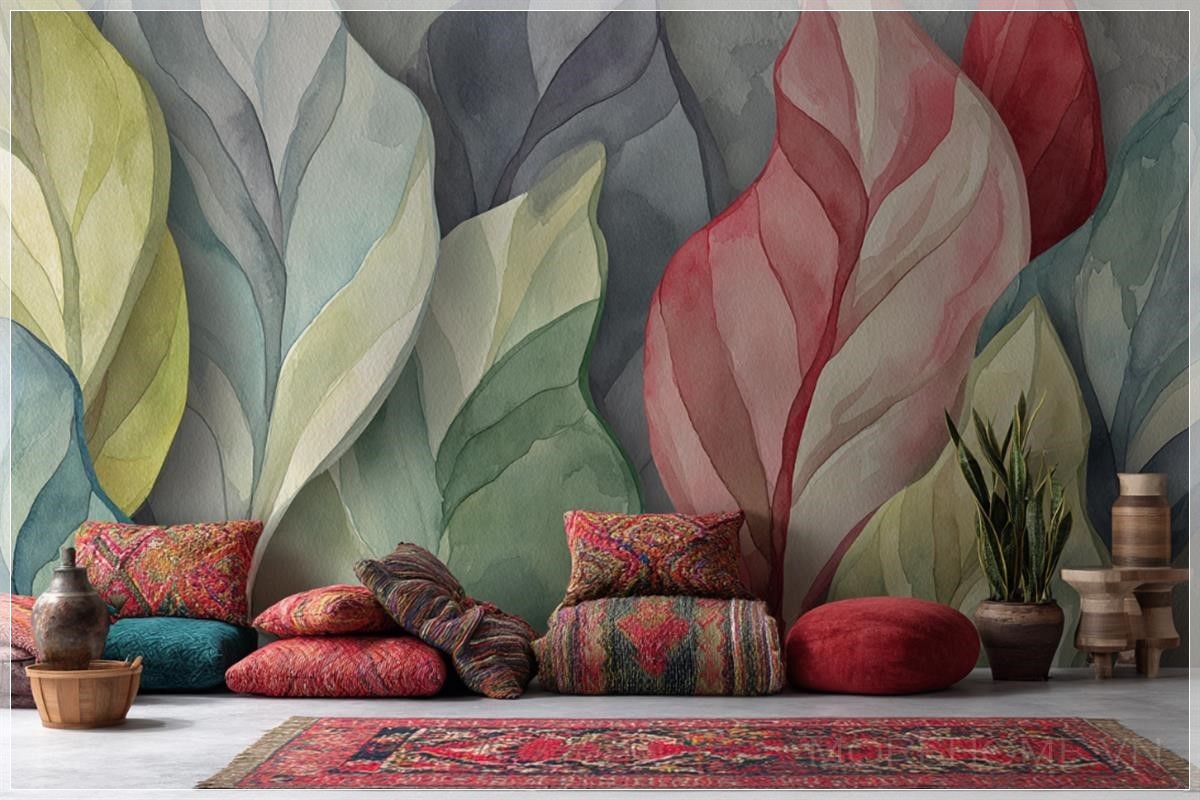 Ánh sáng buổi sáng rọi qua cửa sổ cao, tạo những vệt nắng vàng nhảy múa trên bức tường nghệ thuật. Đứng ở ngưỡng cửa, tôi không khỏi sững sờ trước khung cảnh trước mắt. Bức tranh tường màu nước với những lớp lá chồng lên nhau trong sắc đỏ nhẹ nhàng, xanh lá mềm mại và xám tinh tế như đang thì thầm kể một câu chuyện về thiên nhiên và sự tĩnh lặng nội tâm.