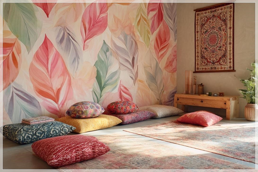 Tấm thảm yoga của tôi trải dọc theo sàn gỗ, hướng về phía bức tường nghệ thuật. Những chiếc gối tựa đủ màu sắc - từ đỏ san hô đến xanh ngọc lục bảo, từ vàng nghệ đến tím lavender - được sắp xếp thành những nhóm nhỏ dọc theo viền phòng. Mỗi chiếc gối như một đóa hoa nở rộ, làm tăng thêm sinh khí cho không gian và cung cấp sự hỗ trợ hoàn hảo cho những tư thế yoga sâu.