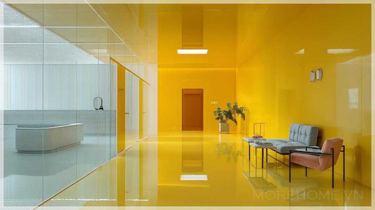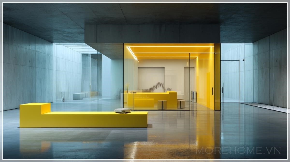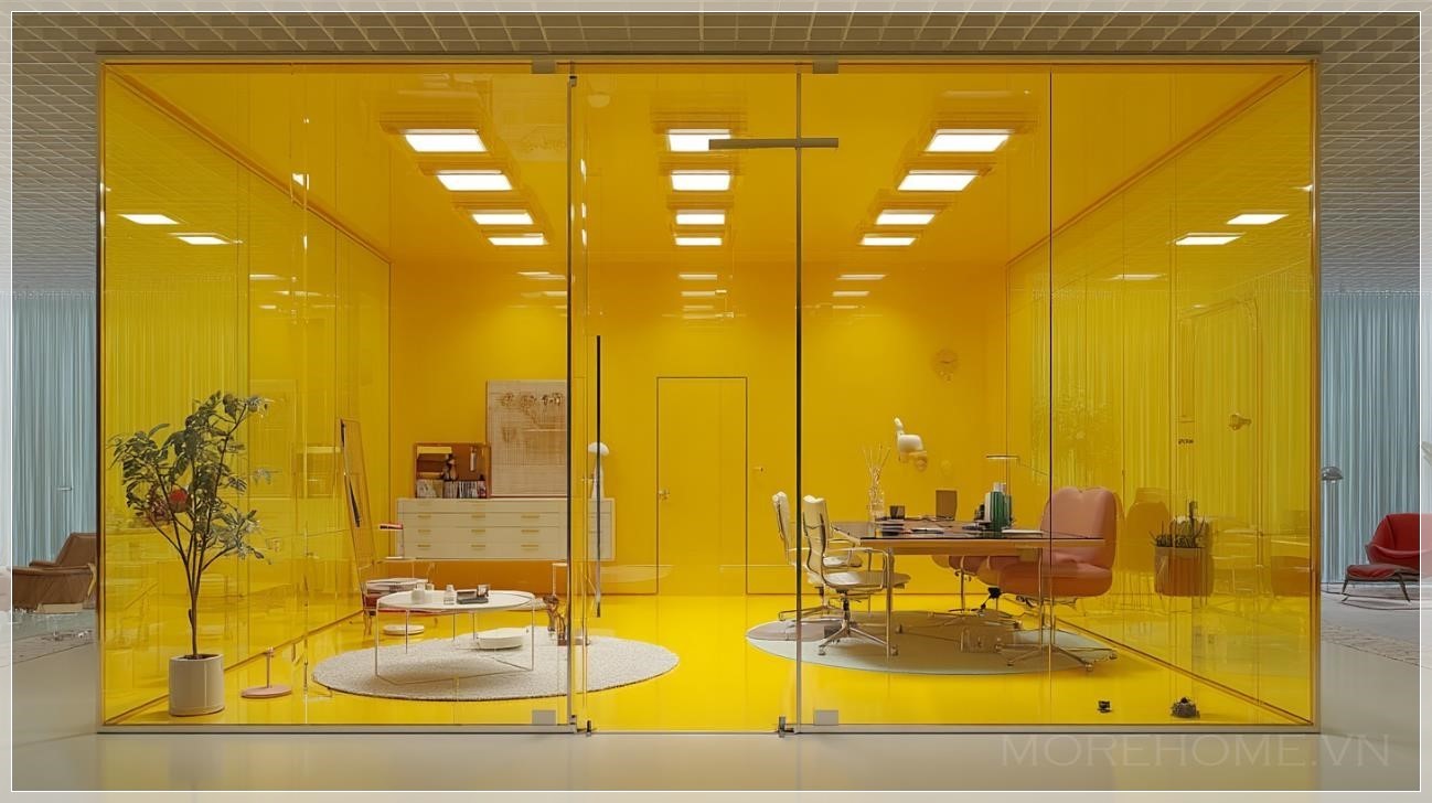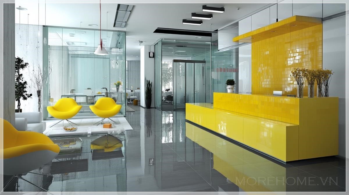 Với sự kết hợp giữa chất liệu kính và những đường nét tối giản, văn phòng ngân hàng màu vàng kính trở thành một không gian làm việc đầy ấn tượng và tinh tế. Màu vàng nhẹ nhàng trên những tấm kính phản chiếu ánh sáng tự nhiên, tạo nên một không gian mở rộng và thoáng đãng. Những bức tường kính trong suốt không chỉ giúp không gian thêm phần sang trọng mà còn mang lại cảm giác cởi mở và gần gũi cho nhân viên và khách hàng.