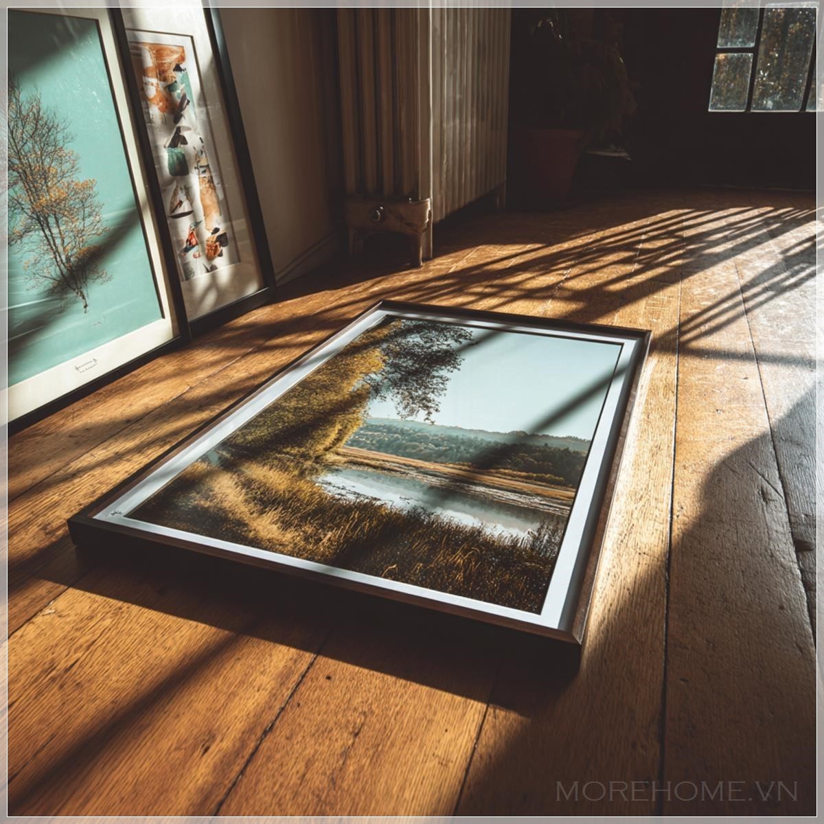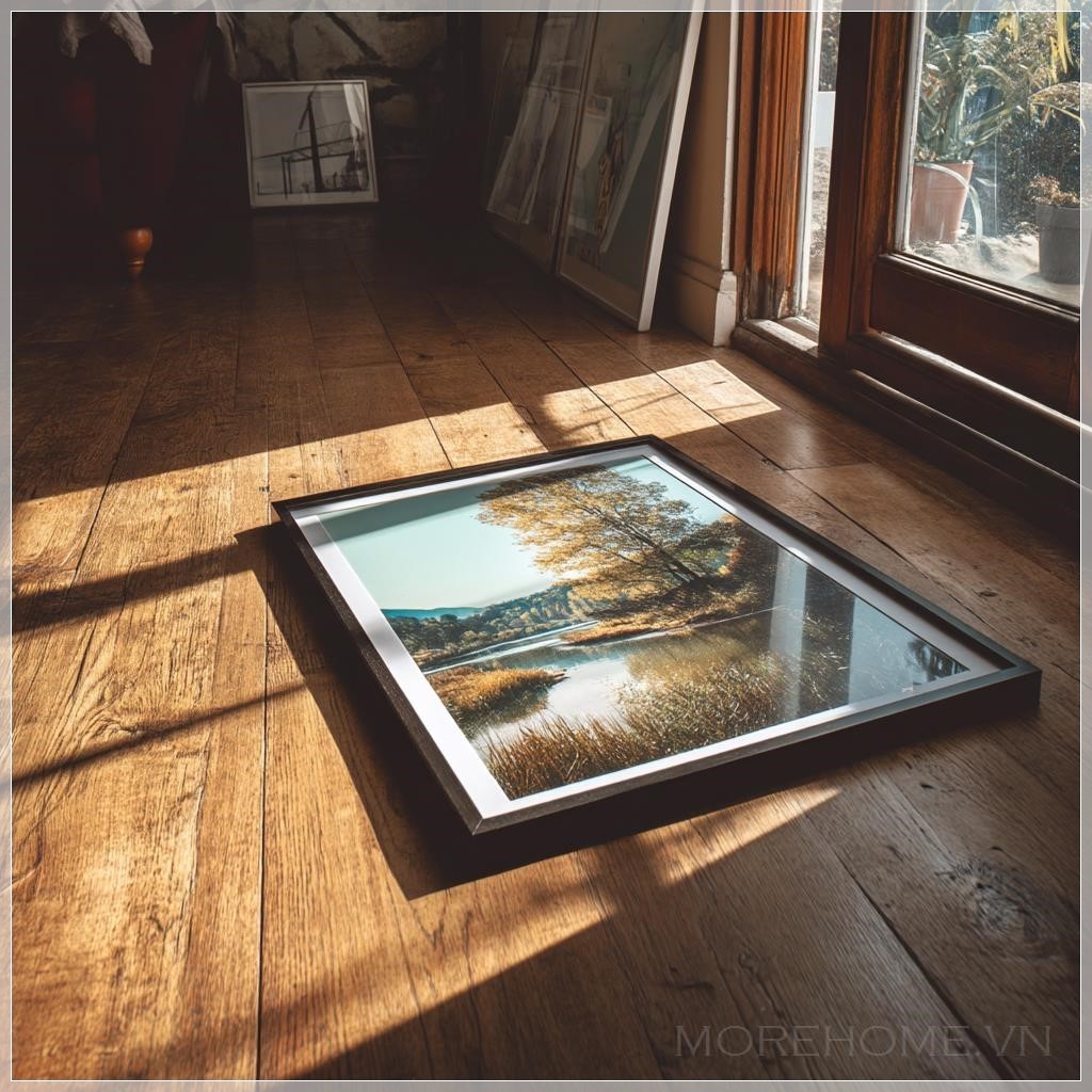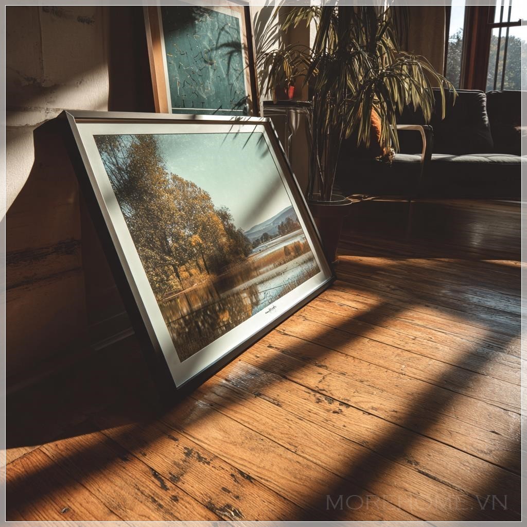 Ánh sáng cuối chiều lướt nhẹ qua ô cửa gỗ cổ kính, chạm vào mặt sàn gỗ sậm màu đã mòn vết thời gian, nơi một khung tranh ngang lớn đang tựa nhẹ vào tường. Đó không phải một sự bày trí ngẫu nhiên, mà là lựa chọn đầy dụng ý – khi ánh sáng chiếu nghiêng, mặt kính của khung tranh phản chiếu không gian phòng như một chiếc gương cổ, mờ ảo, lung linh.