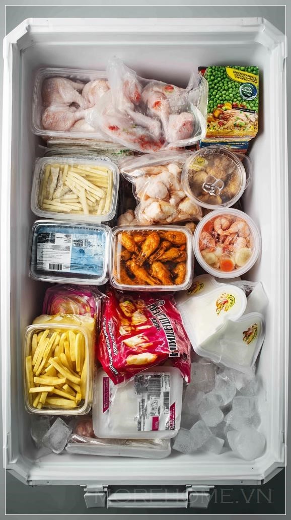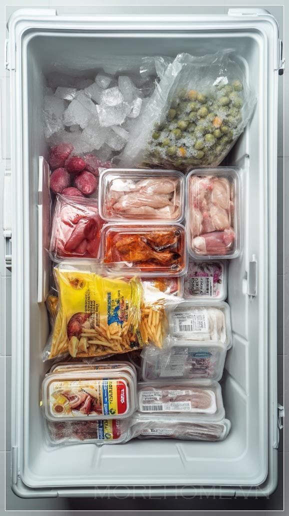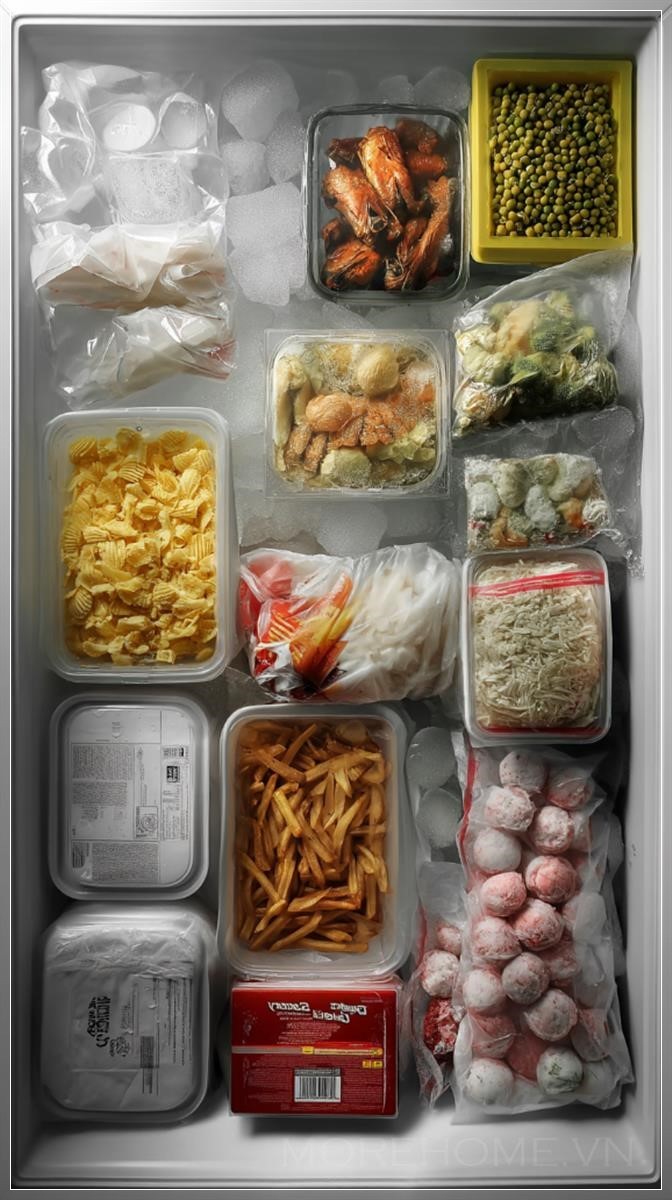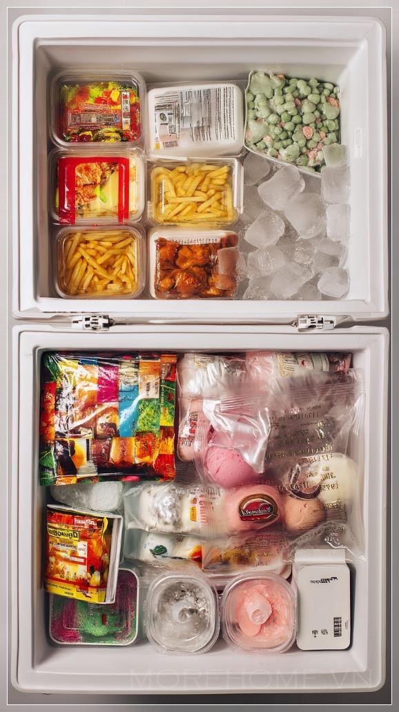 Điểm nhấn của thiết kế này là sự kết hợp màu sắc nhẹ nhàng của nền tường trắng và kem, tạo nên không gian mở và dễ chịu. Những món đồ trang trí đơn giản như túi đựng đậu đông lạnh, thịt, và kem trong tủ đông đều được chọn lọc kỹ càng, với sự cân đối hoàn hảo giữa màu sắc và hình dáng. Tất cả tạo nên một không gian không chỉ phục vụ nhu cầu lưu trữ mà còn mang lại cảm giác dễ chịu cho gia đình, nơi mọi người có thể thư giãn và sáng tạo mà không cảm thấy bị quá tải.