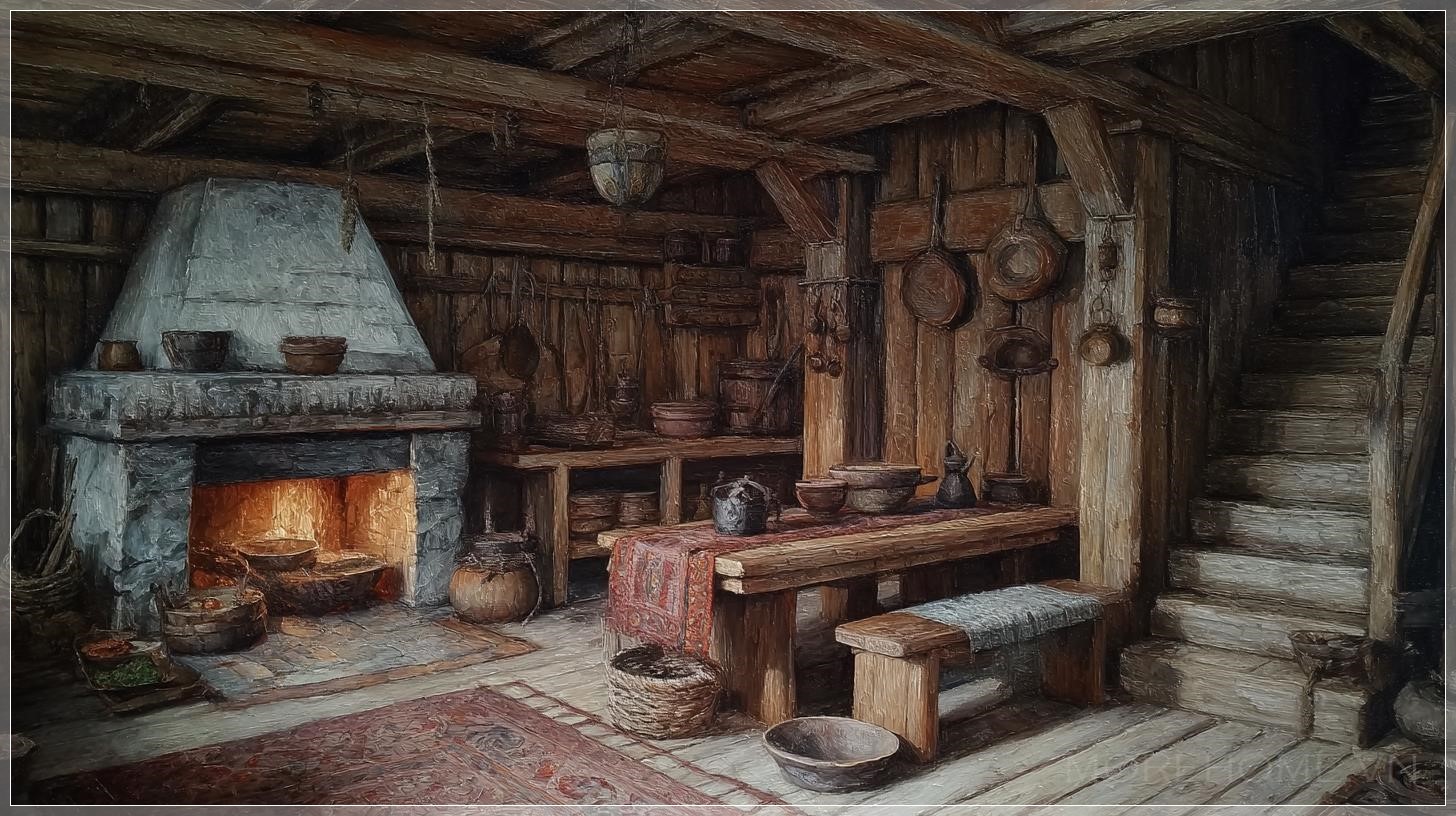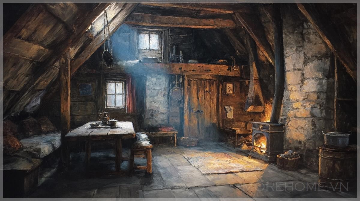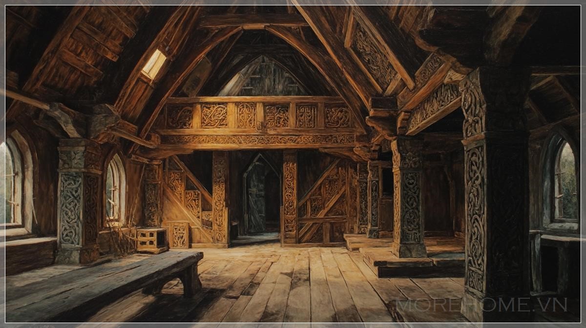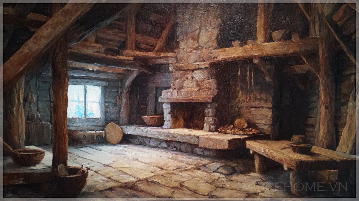 Bức tranh không chỉ là một mô tả về kiến trúc, mà còn là một tác phẩm nghệ thuật mang đậm dấu ấn sáng tạo. Những bóng đổ của ánh sáng xuyên qua các cửa sổ nhỏ, ánh sáng vàng ấm áp phản chiếu trên bề mặt gỗ, tạo nên một không gian huyền bí và đầy lôi cuốn. Các chi tiết như những tấm thảm dệt tay, những chiếc ghế dài bọc vải thô, tất cả đều phản ánh được lối sống giản dị nhưng đầy tinh tế của người Celtic. Mỗi bức tranh không chỉ là một tác phẩm nghệ thuật mà còn là một lời mời gọi về sự trở lại với thiên nhiên, nơi con người và vật liệu từ gỗ hòa quyện vào nhau tạo thành một không gian sống đầy ý nghĩa.